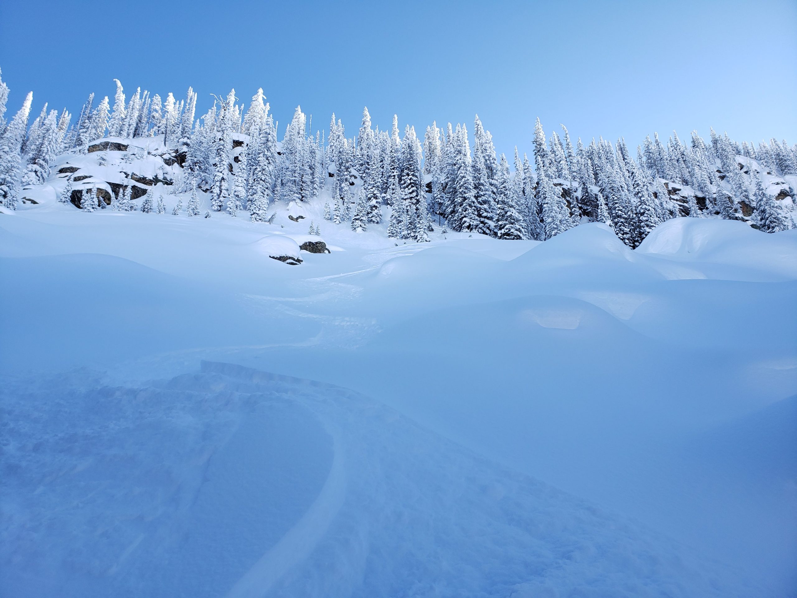 Large wind drifts in the entrance to Rock Chopper and in the gut of Bruiser. Some sluffing on steep shaded aspects. No other signs of instability, no cracking, no collapsing, no recent activity. Did not dig pits today.